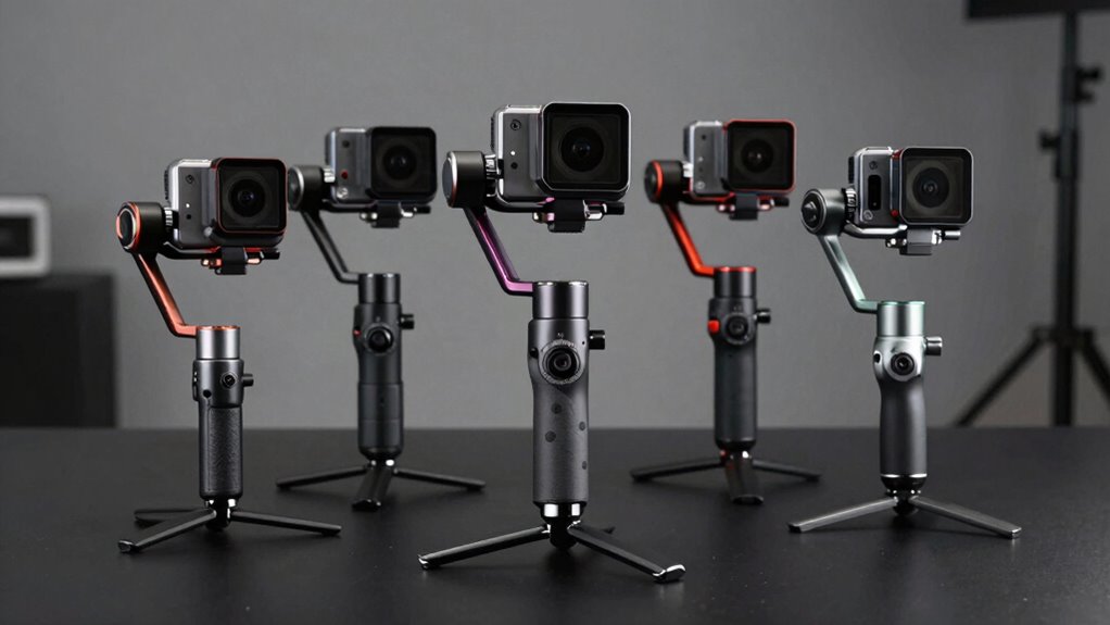 Effective stabilization hinges on a gimbal’s ability to minimize jitters and vibrations, especially during dynamic movements. Three-axis stabilization systems are standard, smoothing out roll, pitch, and yaw, which results in more stable footage. Advanced algorithms, like 10.0 stabilization, can notably enhance shake reduction, even at high speeds. AI tracking features also improve stabilization by keeping the subject in focus, regardless of rapid movements. The reaction time of stabilization algorithms—often as quick as 0.003 seconds—directly affects how well the gimbal responds to sudden shifts. A gimbal with superior stabilization quality ensures smooth footage, minimizes post-production editing, and handles fast, complex shots with ease. Prioritizing these factors helps you choose a stabilizer that delivers consistently steady results across all shooting scenarios.